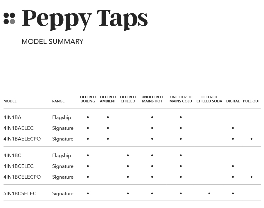 Peppy Taps offer a choice of 5 high quality colour finishes in Chrome, Electroplate or durable PVD finish. This makes it easy to incorporate a Peppy Tap in the colour palette of your interior design.
